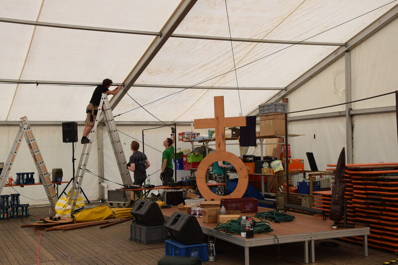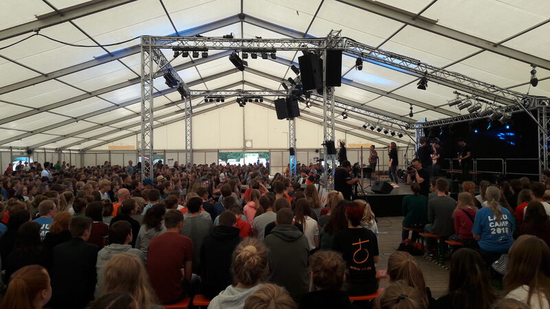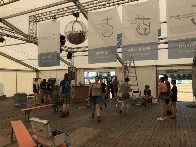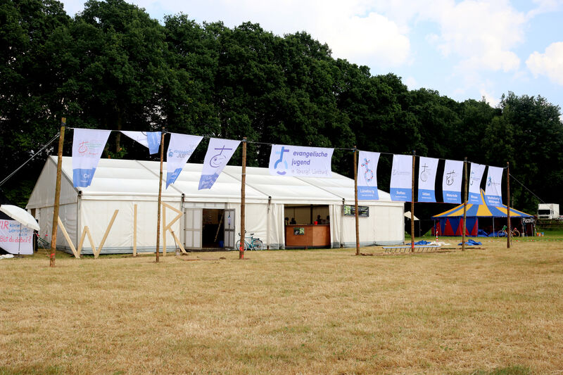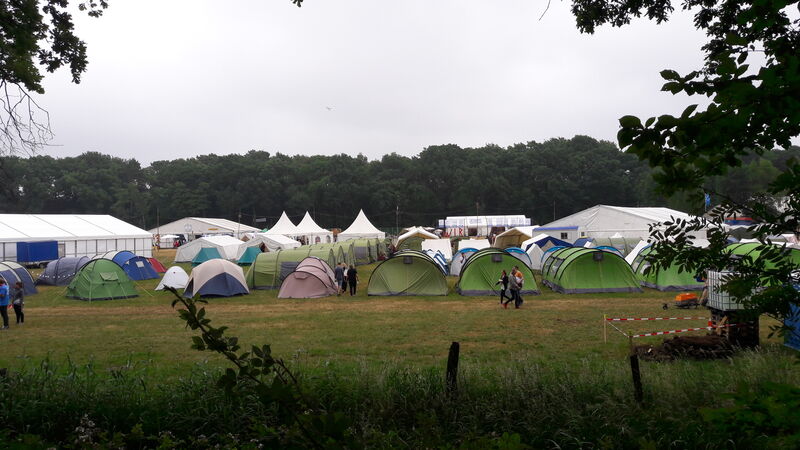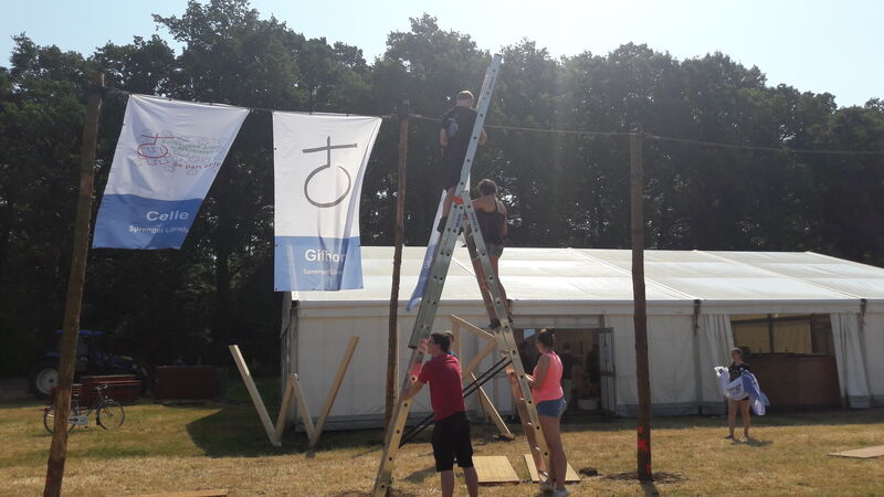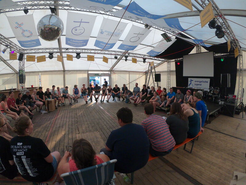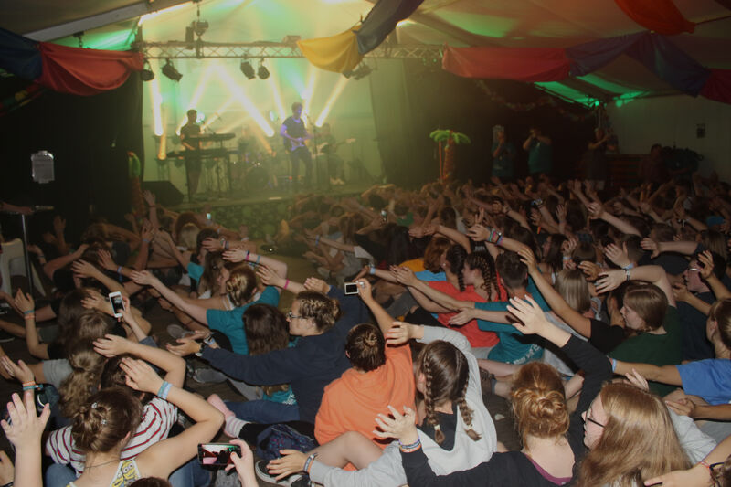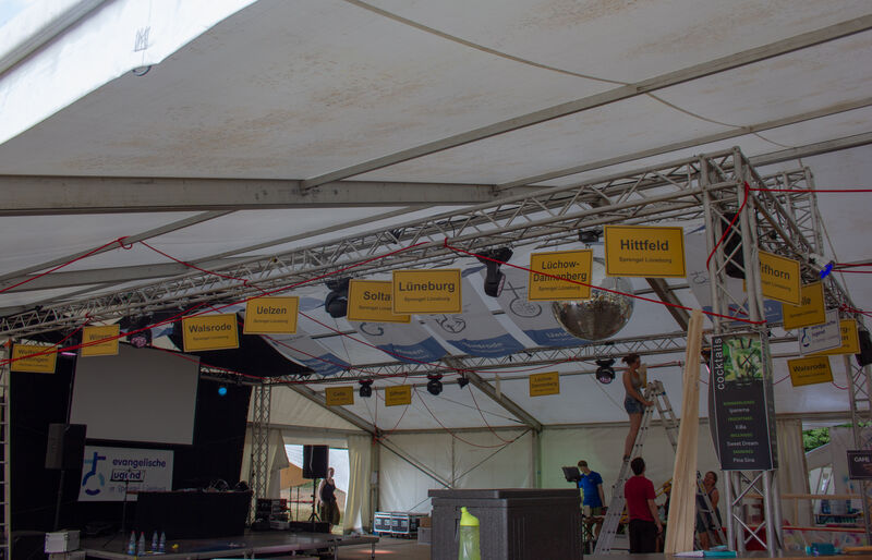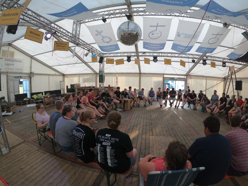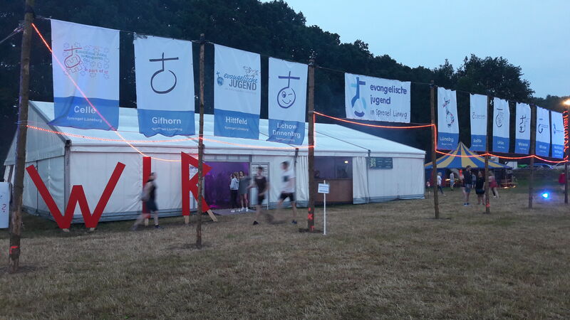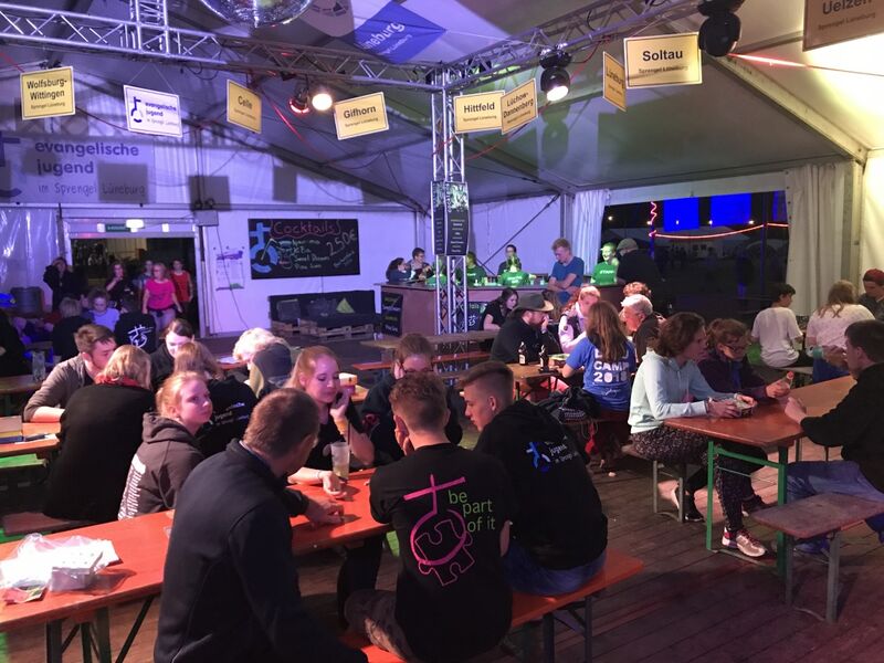 Das Camp wurde vorher von dem so genannten Vorcamp fleißig aufgebaut so dass mit der Ankunft der Teilnehmer alles los gehen konnte. Als erstes bekamen wir alle unsere Festivalbändchen und konnten anschließend unsere Zelte beziehen. Als alle ihren Platz gefunden hatten, gab es ein kurzes einfaches Abendbrot, wo die ersten wichtigen Informationen für das Wochenende geklärt wurden. Um 19:30 Uhr gab es dann im Großzelt die offizielle Eröffnung des diesjährigen Camp. Im Anschluss darauf gab es die Möglichkeit das Campgelände zu erkunden und in den unterschiedlichen Sprengeln die unterschiedlichen Angebote wie die Silentparty im Sprengel Stade oder die Disco in unserem Lüneburger Sprengel auszuprobieren. Um 23:00 Uhr herrschte im Großzelt eine ruhige Atmosphäre. Der Taizè Gottesdienst fand statt und lockte vorallem die, die bereits in Taizè waren an.