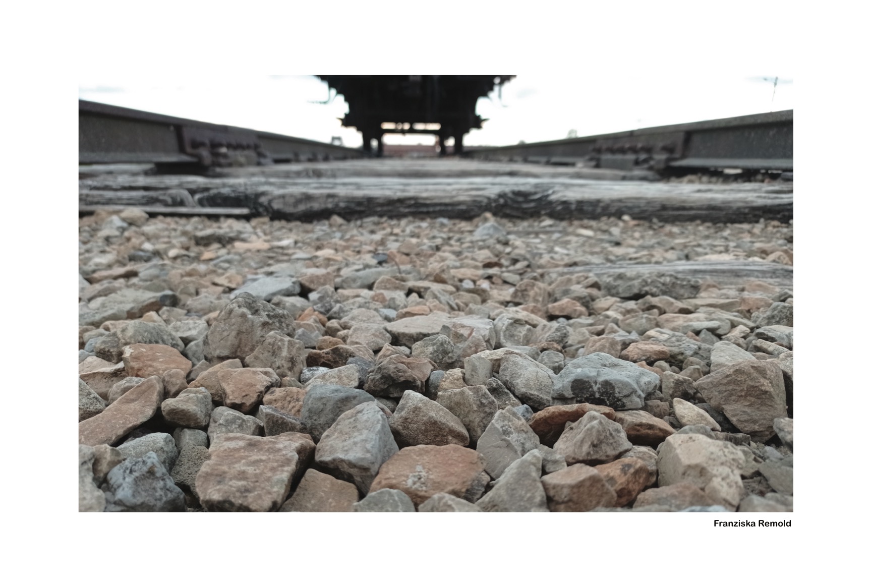 Den Großteil des Fotos nimmt ein Gleisbett ein. Die Steine darin werden im Hintergrund immer